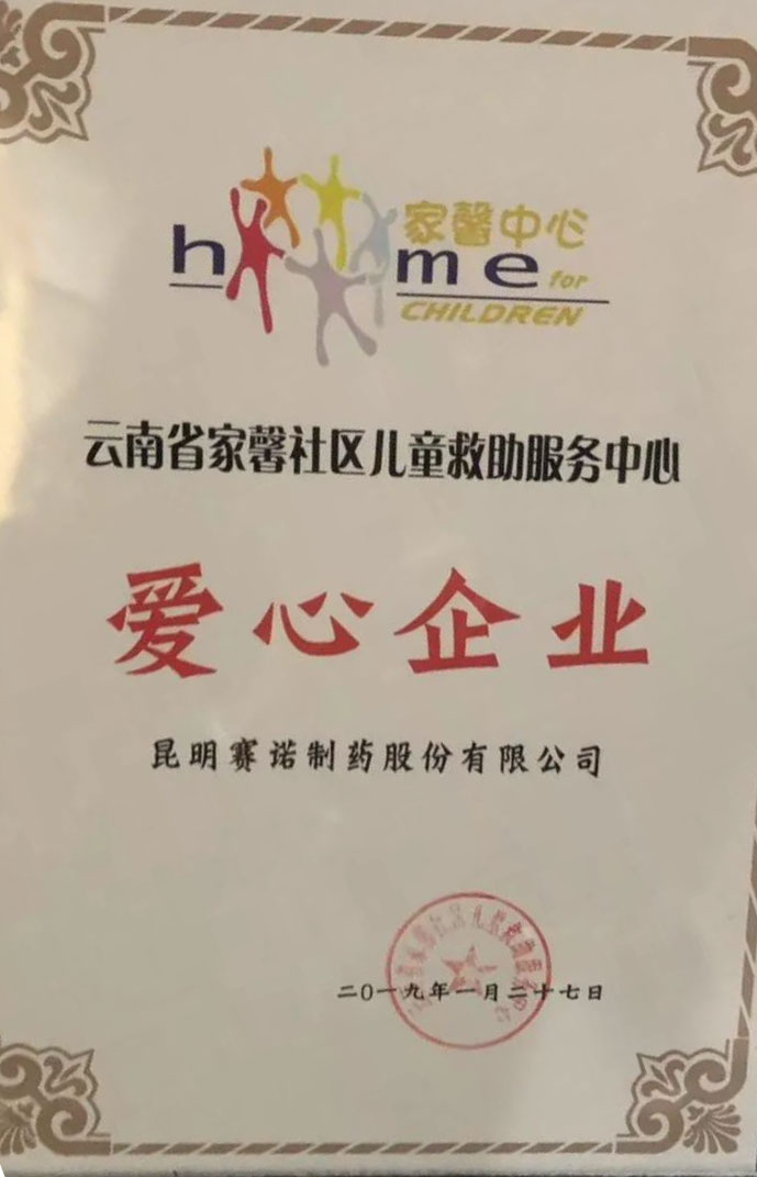 昆明賽諾制藥股份有限公司被“家馨”授予愛心企業(yè)稱號