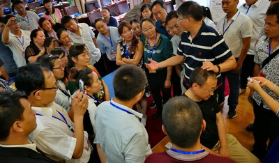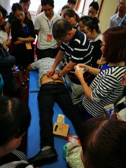 魏教授演示背部點揉法,基層醫生學員們將魏教授團團圍住,邊聽邊看邊記錄,學習熱情高漲。演示模特均由學員自愿擔任,圖中女醫生當時正好左上腹疼痛,經魏教授點揉、拔/走罐等治療后,疼痛立解。立竿見影的治療效果大大提升了醫生們的信心。